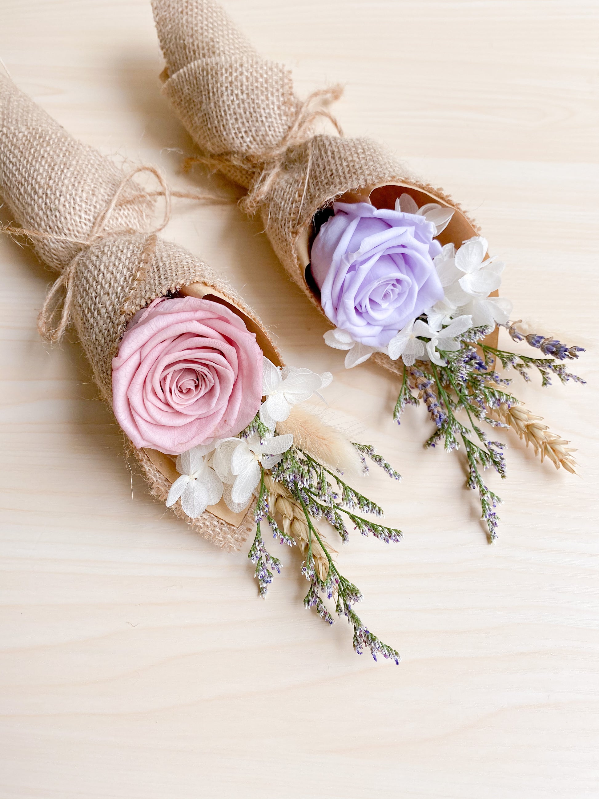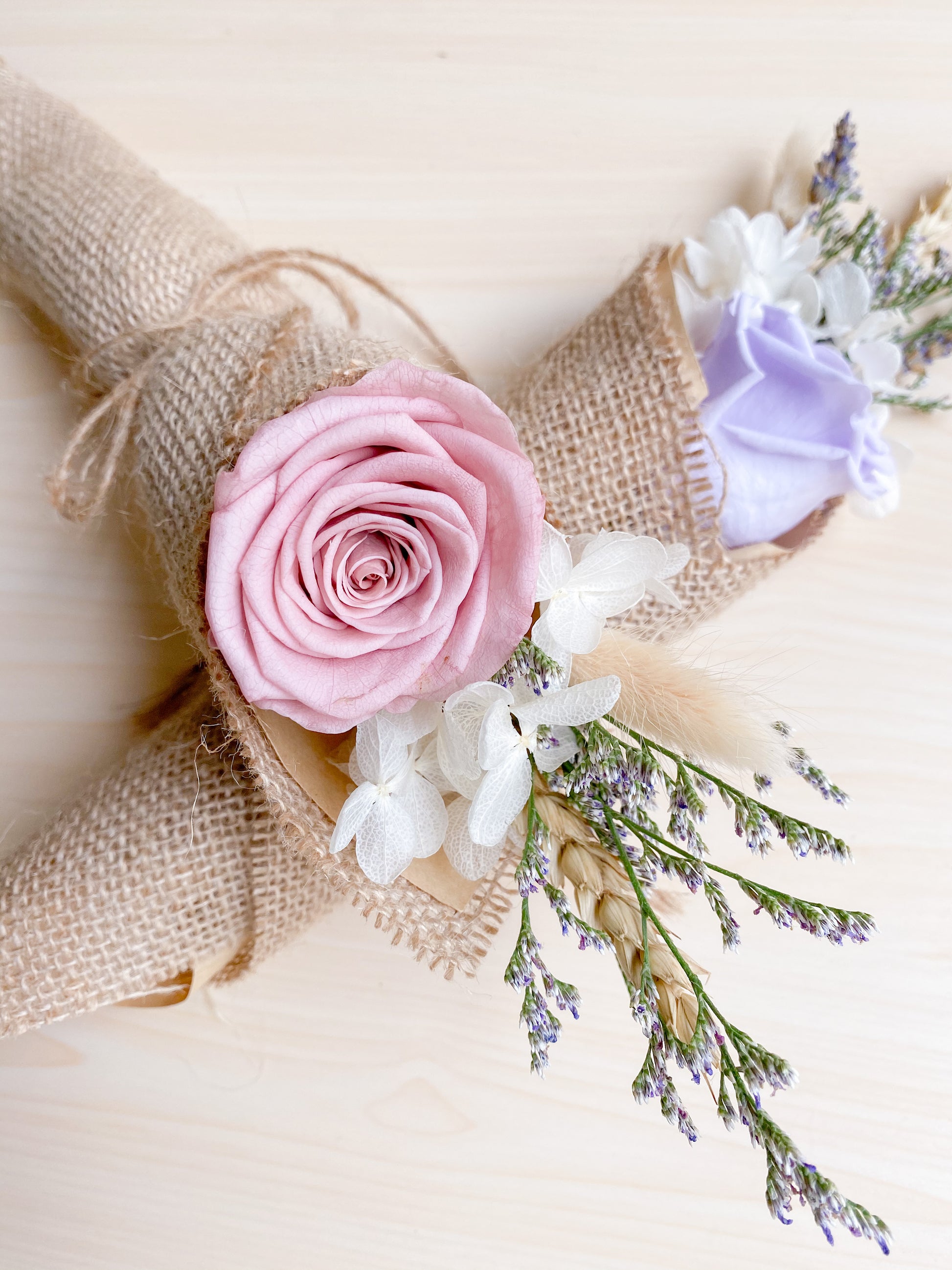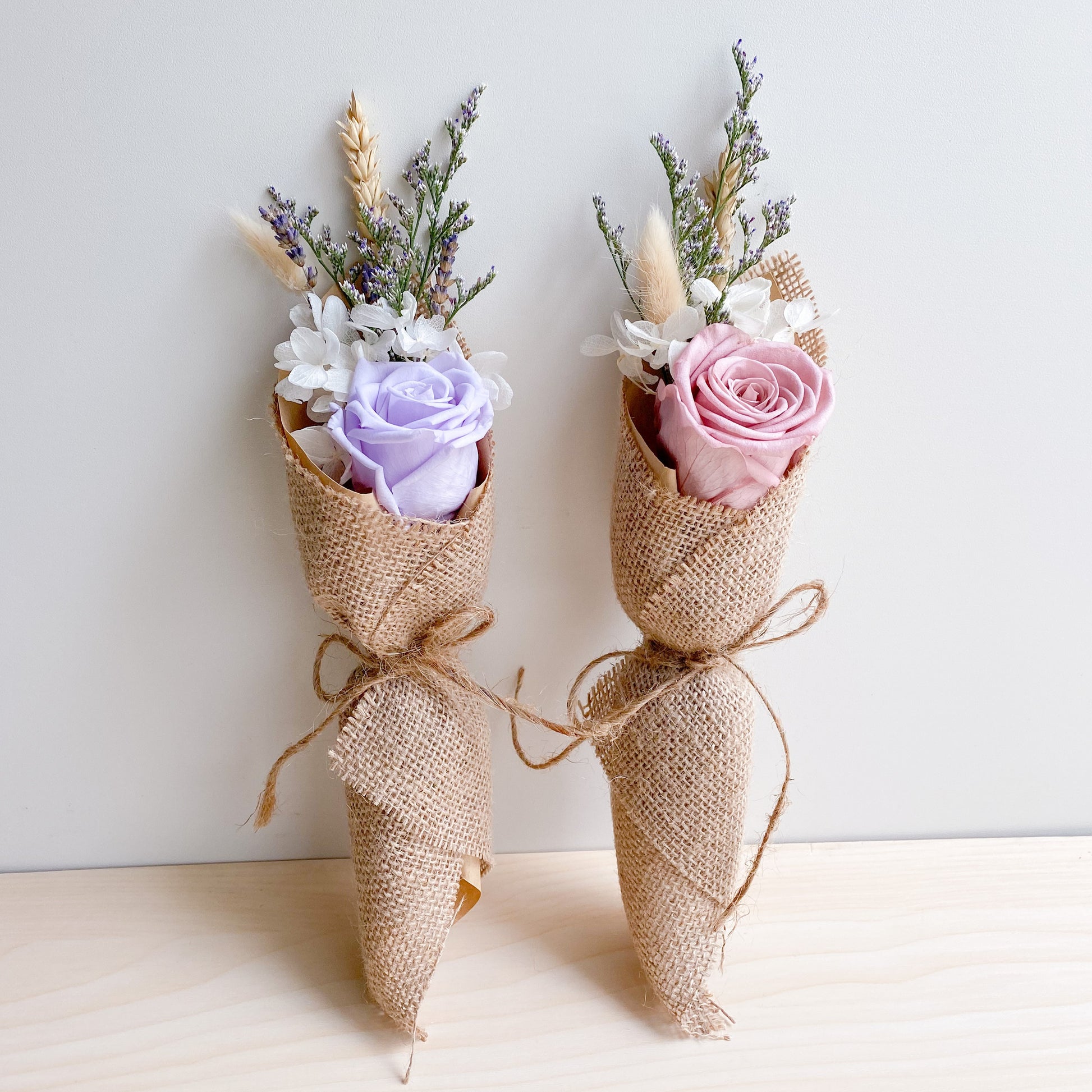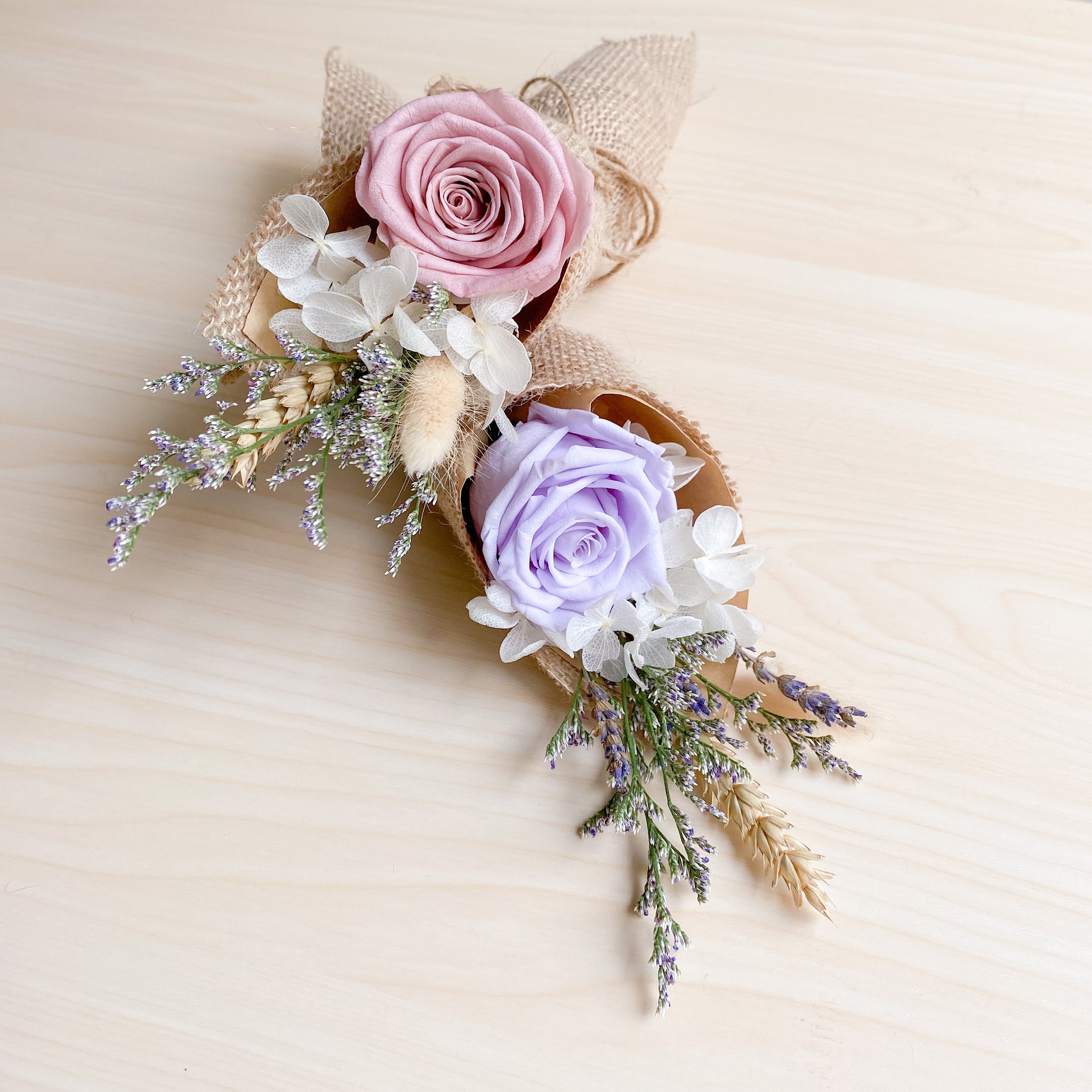 Little Grace Bloom, featuring preserved lilac/pink rose and white hydrangeas from Japan wrapped with kraft paper and rustic jute wrap and twine.