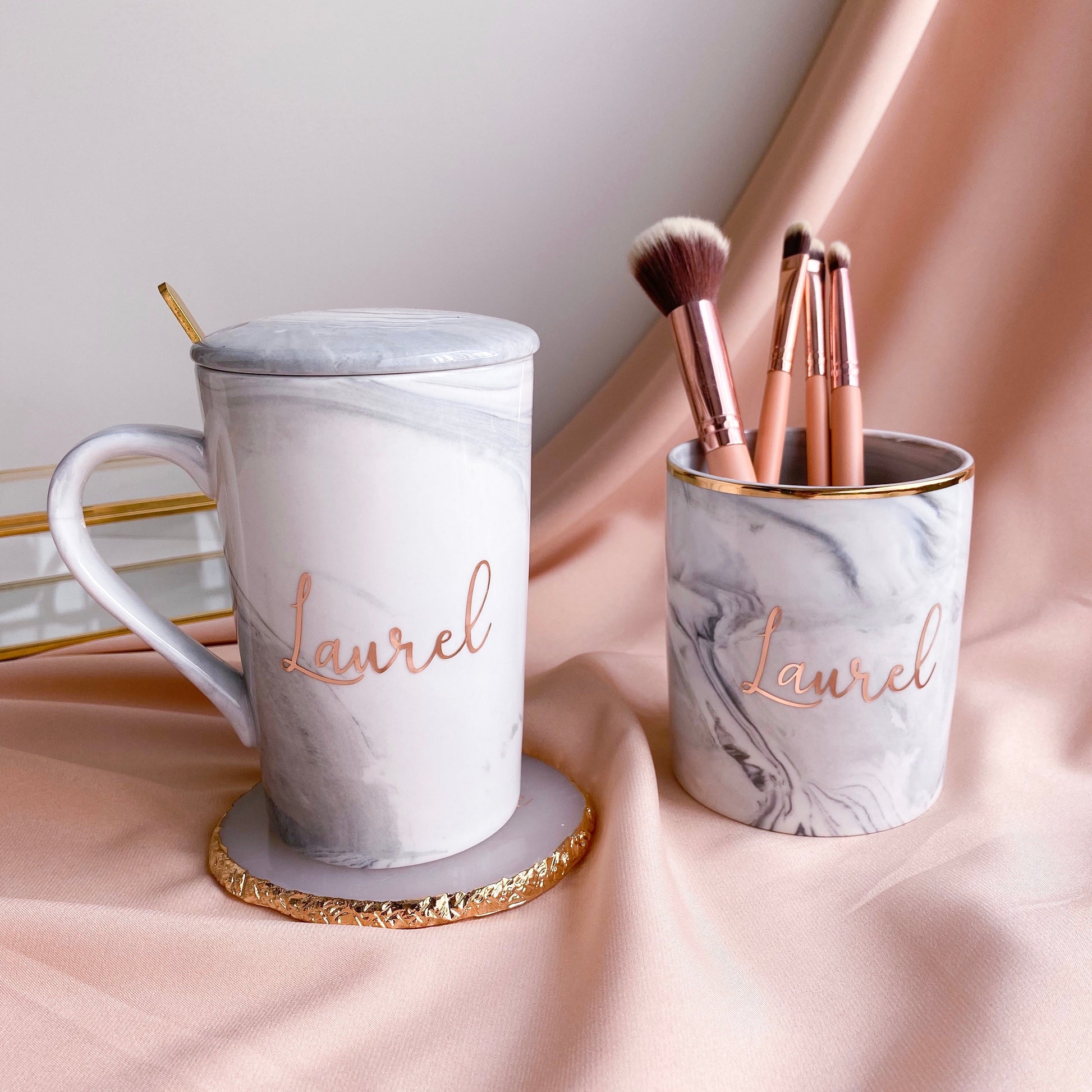 This custom make-up brush or stationery holder is the perfect personalised gift for someone special. Made from high quality, durable ceramic and available in black or white with a marble effect, this product is sleek and stylish.