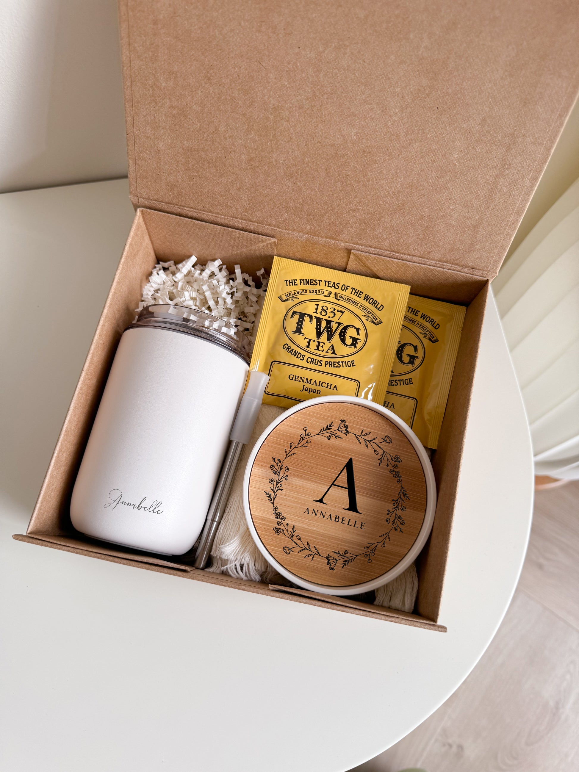 This set includes a stainless steel coffee tumbler, a beautifully engraved bamboo coaster with a floral wreath design, a soft cream tea towel, and two packets of premium TWG tea. Perfect for friends, bridesmaids, or birthdays, it’s a thoughtful way to show you care.